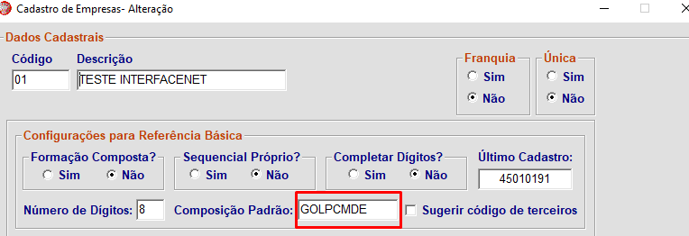 - No campo Composição padrão acrescente a letra referente ao atributo (posicionando o mouse no campo, o sistema indica a letra para cada atributo);