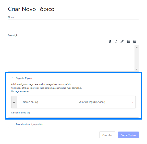 - Clique em 'Salvar Tópico'.Você pode adicionar quantas Tags achar necessário. Para vinculação ao tópico, basta clicar em 'Adicionar outra tag'.