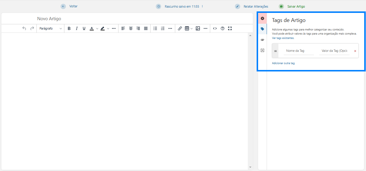 - Clique em 'Salvar Artigo'.Você pode adicionar quantas Tags achar necessário. Para vinculação ao artigo, basta clicar em 'Adicionar outra tag'.