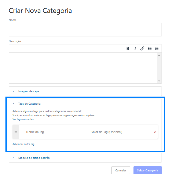 - Clique em 'Salvar Categoria'.Você pode adicionar quantas Tags achar necessário. Para vinculação à categoria, basta clicar em 'Adicionar outra tag'.