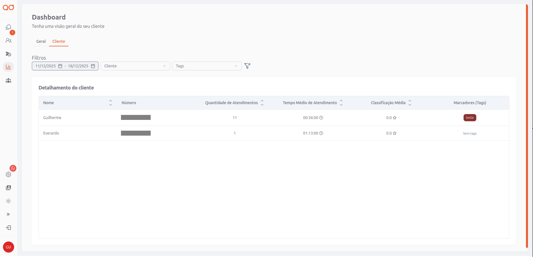 Nesta aba, é detalhada por cliente todas as métricas de atendimento feitas.