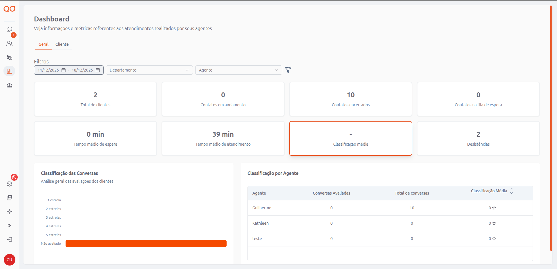 Utilizando o Dashboard você tem uma visão completa dos dados e métricas mais importantes sobre o atendimento realizado pelos seus agentes e sobre os clientes que entram em contato. O objetivo é fornecer transparência e ferramentas para você acompanhar a eficiência e a qualidade do serviço prestado pelo seu canal de atendimento.