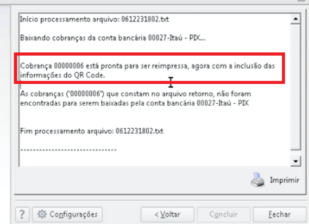 O sistema exibirá uma mensagem confirmando que a cobrança está pronta para ser reimpressa, agora com as informações do QR Code.