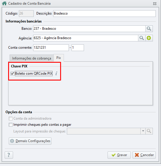 Para o QR Code seja gerado no boleto, é necessário primeiro configurar a chave no cadastro da conta bancária, siga o passo a passo: