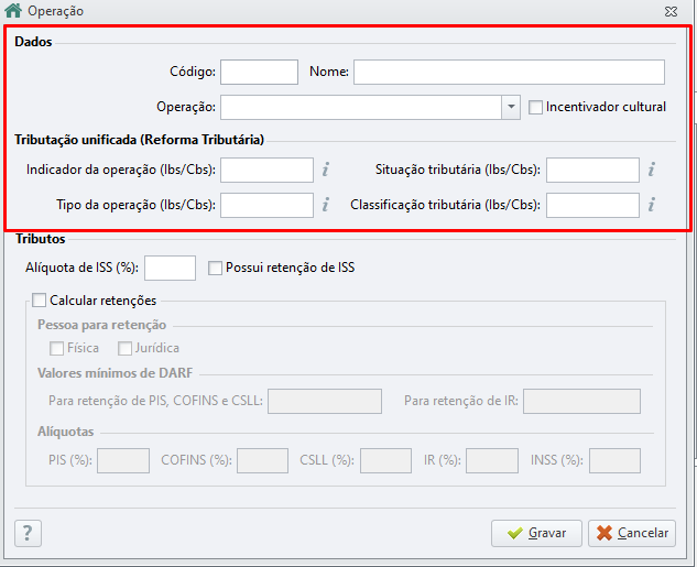 você deve configurar as alíquotas e retenções que incidirão sobre a operação. Embora estejamos em transição para o novo modelo de Tributação Unificada, o preenchimento dos impostos atuais ainda é necessário para a validade fiscal imediata.
