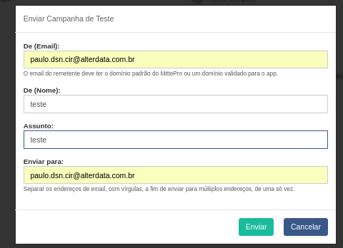 De email(E-mail) : Esse campo informaremos o email do remetente. Para ser um email válido, ele deve está cadastrado e devidamente Confirmado na aba domínios do APP.
