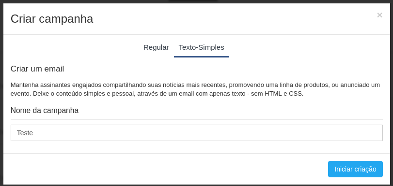 Clicamos no botão "Nova campanha" será apresentado o Wizard de criação, escolheremos a campanha "texto simples" e informaremos o nome da campanha e em 4 passos podemos criar toda a campanha e enviar o email.