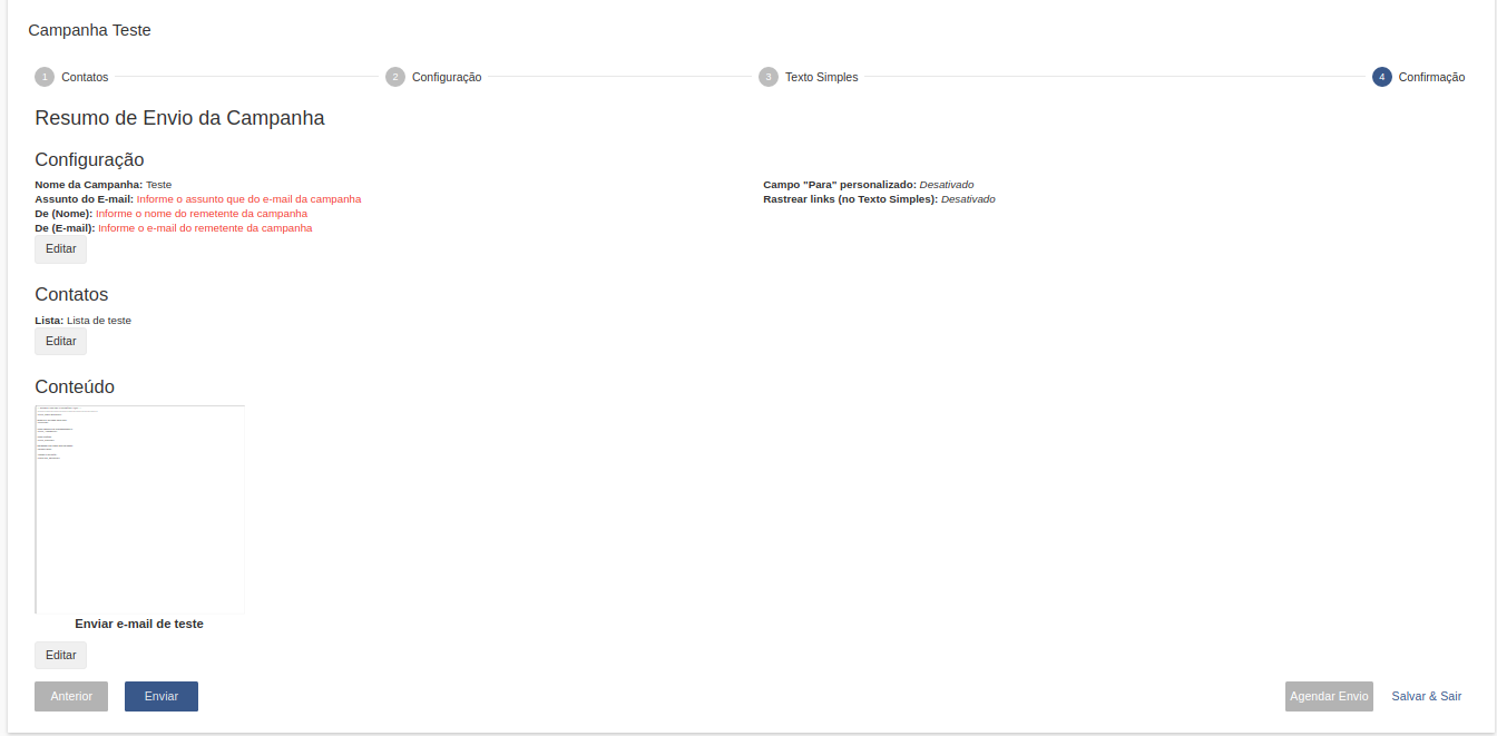 No passo 4 podemos rever todas as informações da campanha antes de enviar ou agendar seu envio. Esse é o ultimo passo antes de finalizarmos a campanha. Caso algum passo tenha ficado com informação faltando, o envio ou agendamento da campanha não será permitido. No passo 4 é informado quais informações estão incorretas para serem ajustadas.