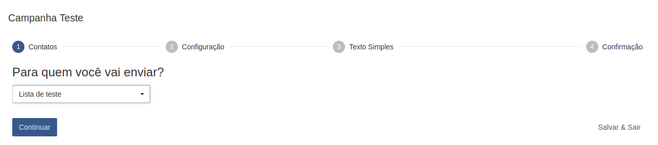 No passo 1 informamos a "Lista" com os contatos que vão receber o email da campanha. Selecione a 'lista' e avance ao passo 2. A navegação entre os passos, pode ser feita clicando no botão 'Continuar' ou clicando direto no passo desejado.