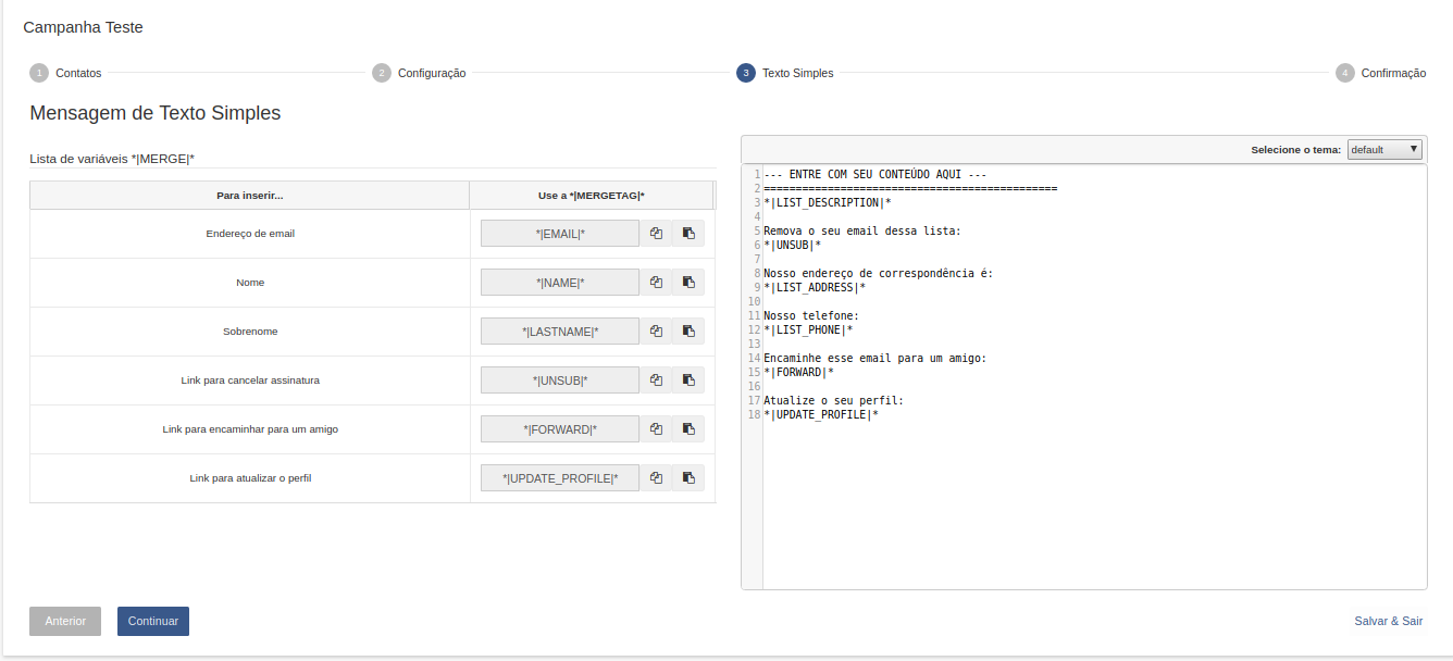 No passo 3 informaremos o contéudo do email que será enviado. Como a campanha é texto simples, não usaremos CSS ou HTML no contéudo do email. Vamos utilizar somente texto para deixar um contéudo mais simples e pessoal.