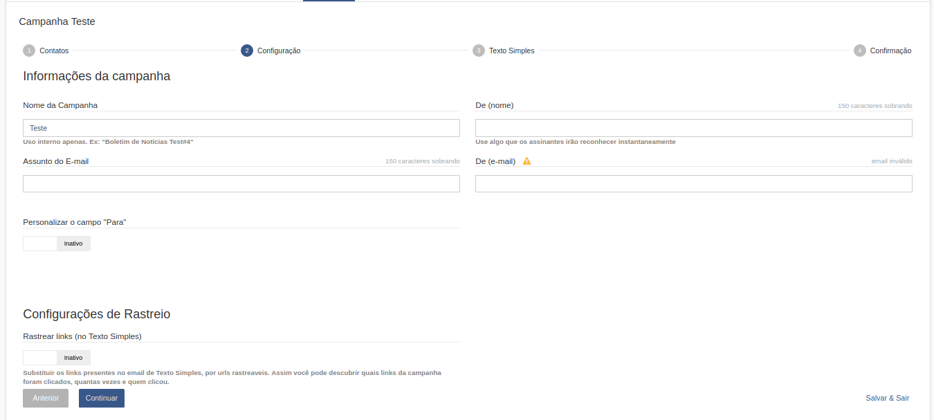 No passo 2 informamos as configurações necessárias para o envio. Repare que há uma validação nas informações preenchidas. Caso algum passo tenha alguma informação faltando ou incorreta, o ícone é alterado para o alerta em vermelho. Só será possível enviar a campanha, quando todos os passos estão preenchidos corretamente. Abaixo segue uma explicação sobre cada campo.