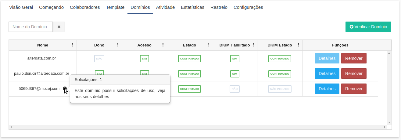 Para permitir o acesso, o usuário dono do domínio, deve acessar o APP e ir na aba domínio. Repare que há um alerta no domínio informando que há uma solicitação de acesso. Para aceitar clique no botão "Detalhes"