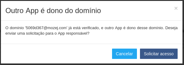 Hoje no Mitte pro é possível compartilhar o domínio com outros apps e usuários, porém é necessário que o dono do domínio autorize. Assim que tentarmos cadastrar um domínio que já foi habilitado por outro usuário, o sistema de forma automática nos avisa e nos fornece a opção de solicitar acesso ao domínio. Clicando em 'Solicitar acesso' será enviado uma requisição ao dono do APP. O dono do APP tem o prazo de 7 dias para responder. Passando esse prazo a requisição expira e perde a validade.