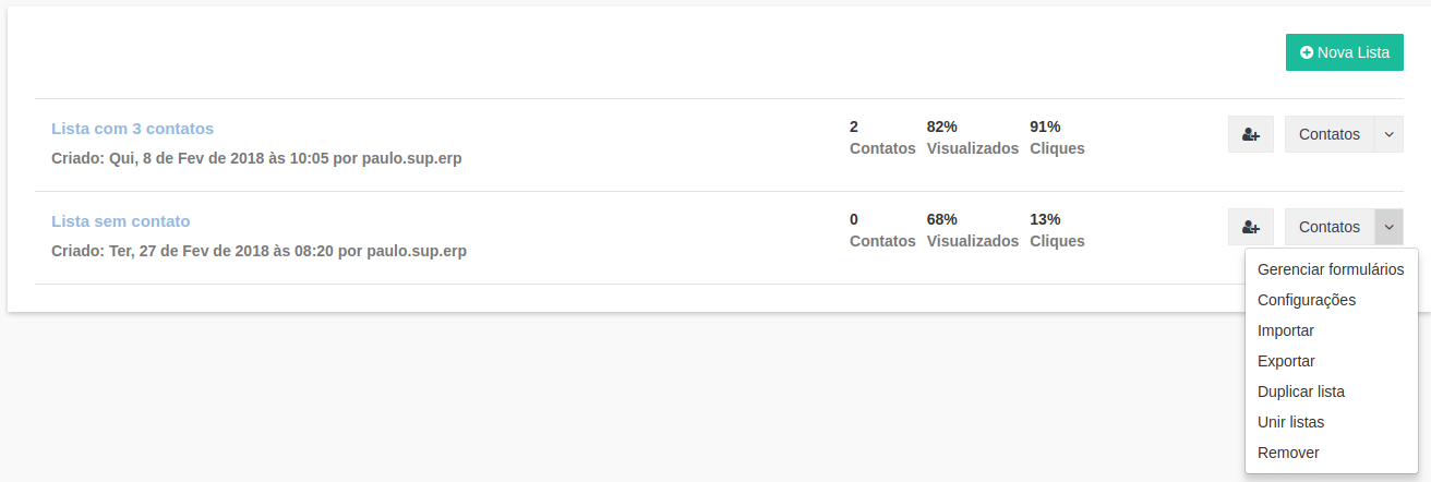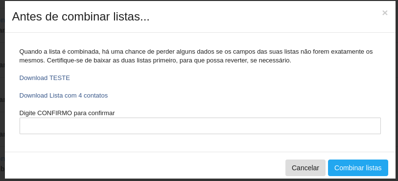 Obs: Importante ficar alerta, pois caso tenha o mesmo contato nas duas listas com informações distintas (nome, sobrenome e aniversário), estas serão atualizadas com os dados da lista que está cedendo os contatos. Logo se o contato já estiver na lista, atualizaremos sua informações. Recomendamos fazer o download da lista antes da união.