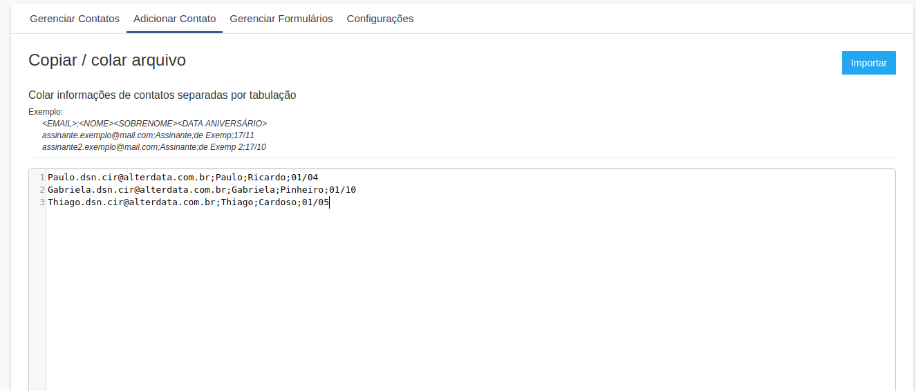 - O contéudo a ser importado, deverá seguir o seguinte padrão EMAIL ; NOME; SOBRENOME ; DATA ANIVERSÁRIO; (A data de aniversário deverá ser DD/MM vide imagem acima)