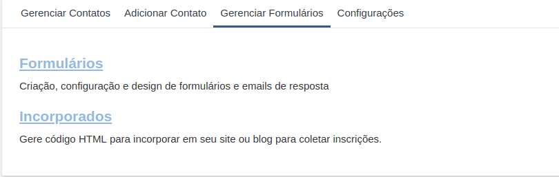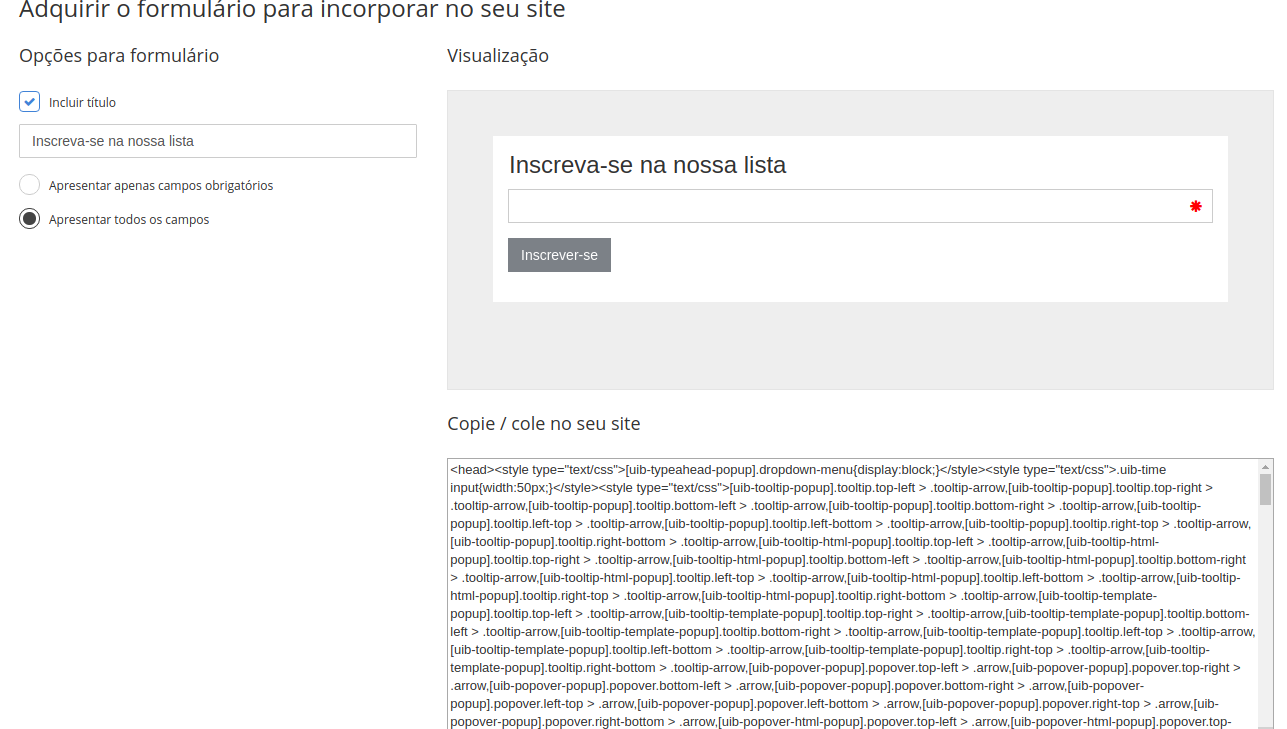 Permite a geração de código HTML para o formulário criado. O intuito desse código, é ser incorporado em sites ou blogs a fim de coletar inscrições em sua lista.