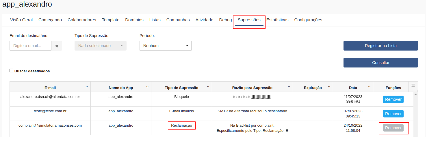 - A lista de supressão está presente agora dentro de cadas app;