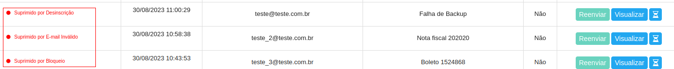 - Foi adicionado também aos envios cujos destinatários foram suprimidos a informação de porque fora suprimido e se foi suprimido por já está na nossa lista de supressão ou se foi uma supressão da AWS (Amazon). Para verificação dessa ultima informação basta parar o mouse sobre o status em questão por ex: Ao passar o mouse sobre o status 'Suprimido por Bloqueio' temos a seguinte informação "O Mitte Pro suprimiu o envio para esse email, porque já houve um ou mais bloqueios para o mesmo".