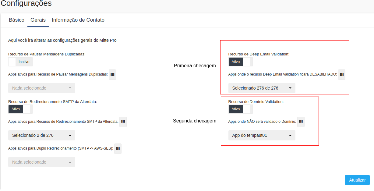 - Dividimos a validação profunda em duas etapas, a validação profunda consiste em fazer uma checagem para ver se o destinatario é valido ou não, para isso fazemos uma consulta no provedor de email do destinatário via SMTP, essa é primeira parte, a segunda, constiste em averiguar a autentencidade do Domino em questão. Essas configurações estão em Configurações na ABA Geral do Mitte Pro, e podem ser configudas para projetos (app's) de forma indivudual. Porém apenas adminstradores do site podem altera-las.