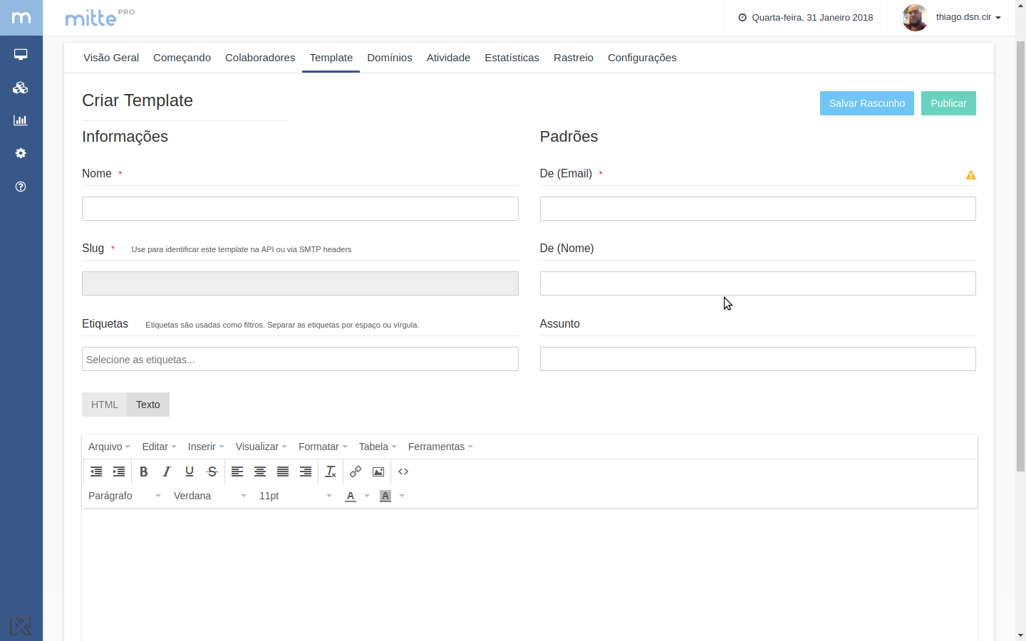 Clicando no botão "Novo Template" você será redirecionado para a página de criação do template.
