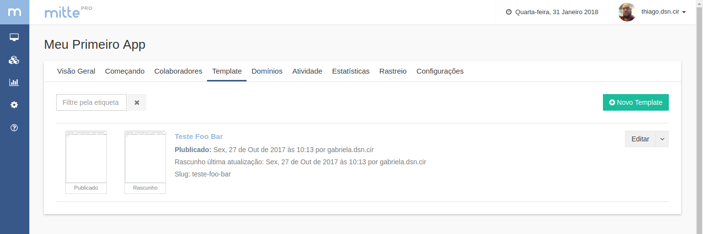 É possível visualizar a versão Rascunho e Publicada. Também é possível ir para a tela de edição desse template.