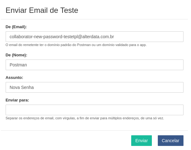 Ao clicar no botão 'Enviar e-mail de teste' será aberto uma pequena janela, onde poderá colocar vários e-mails, separando cada um deles com vírgulas. O Postman irá enviar o template, sem nenhuma alteração, para os e-mails fornecidos.