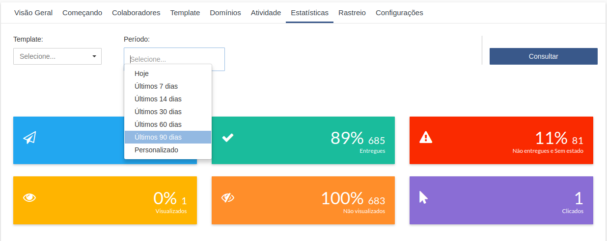 O Painel de Estatísticas tem por função fornecer detalhadamente um relatório das estatísticas dos emails enviados pelo APP.