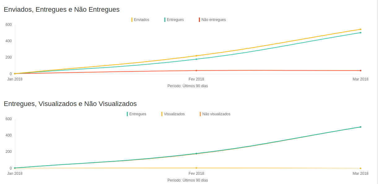 - Gráficos de emails entregues, visualizados e não visualizados.