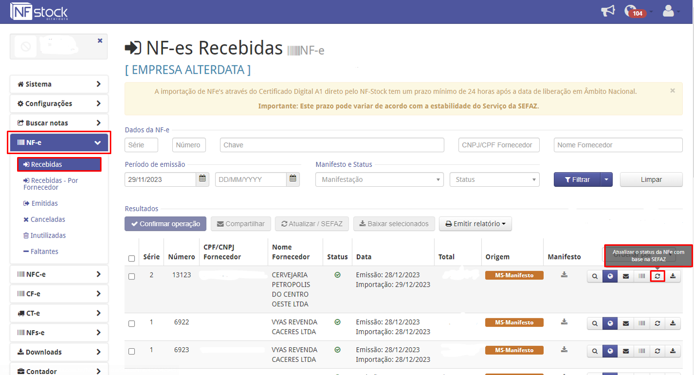 Atualizar o status da NF-e com base na Sefaz - Nf-stock