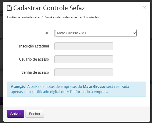 - A baixa de NFe de empresas do Mato Grosso será realizada somente com certificado digital do MT informado à empresa.