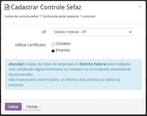 - A baixa de notas para empresas do Distrito Federal (DF) será realizada pelo Controle Sefaz informando o Certificado Digital da própria Empresa ou do Contador, e então será feito a busca automática de NFe, CTe e NFCe de notas emitidas e recebidas pela Sefaz Distrito Federal (DF)