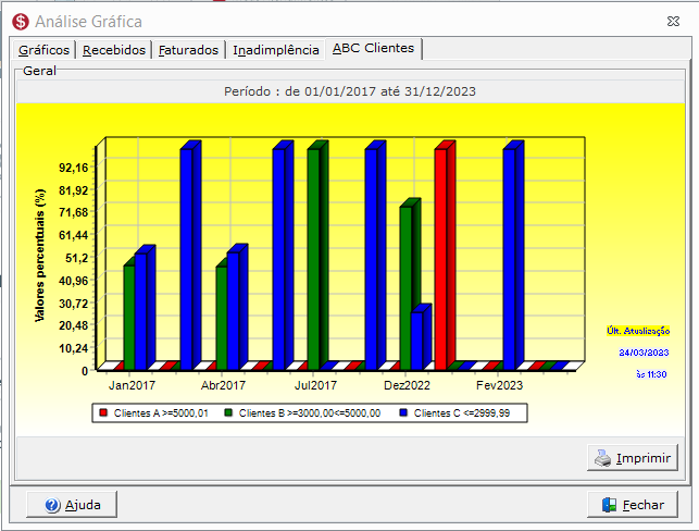 Serão apresentados os valores apenas da(s) cobrança(s) impressa(s) com data de vencimento no período que foi selecionado para consulta. A soma de cada cliente determinará se naquele período o mesmo foi classificado como A, B ou C.