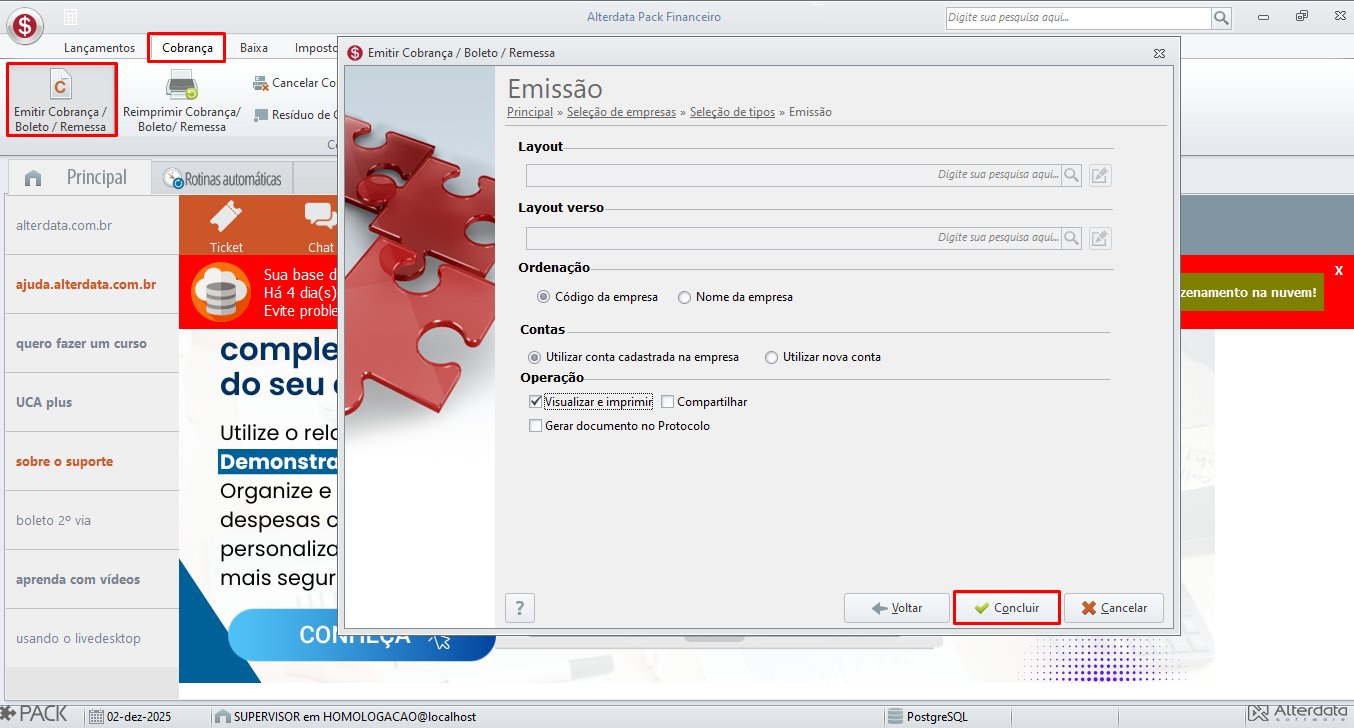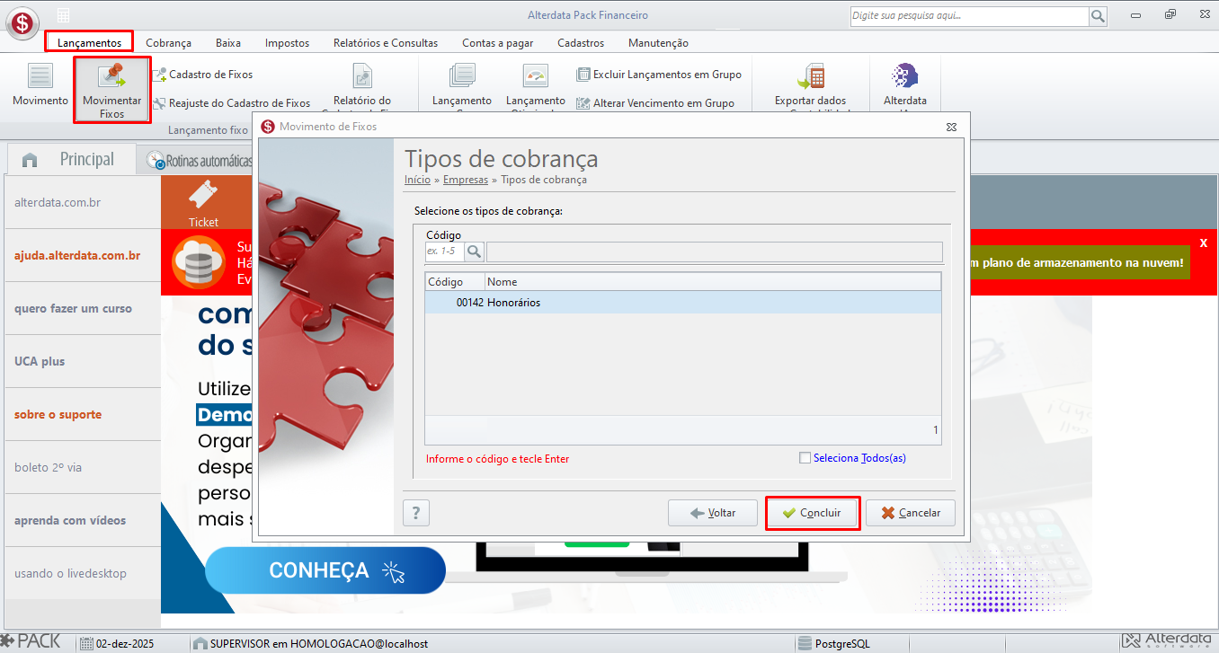 - Informe a Apuração, marque o tipo de Cobrança e clique em Avançar;