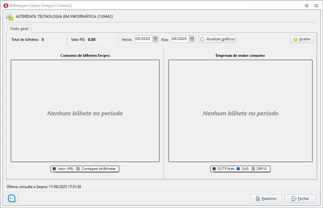 Não havendo nenhum envio de declaração que consome a API Serpro, será exibido um gráfico vazio com a mensagem "Nenhum bilhete no período" indicando que nenhuma obrigação foi enviada no período selecionado, garantindo clareza na interpretação dos dados apresentados.