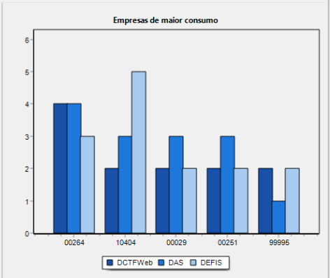 Este quadro apresentará o Top 5 das empresas do escritório que mais consumiram bilhetes. Para cada empresa listada, serão exibidas três barras representando o total de bilhetes utilizados para cada obrigação: DAS, Defis e DCTFWEB, incluindo os envios feitos por outros sistema PACK e que utilizam do mesmo recurso Serpro.