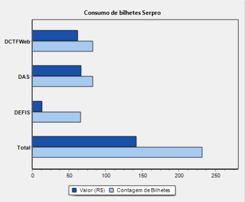 Entre eles, está o Quadro 1 – Consumo de Bilhetes Serpro, que apresenta uma barra indicando o total de bilhetes utilizados por obrigação, incluindo DAS, Defis e DCTFWeb. Além disso, conta com o Totalizador, que abrange todos os envios realizados pelo sistema Fiscal e outros sistemas PACK e também representa os valores correspondentes a serem pagos, permitindo um acompanhamento mais preciso dos custos.