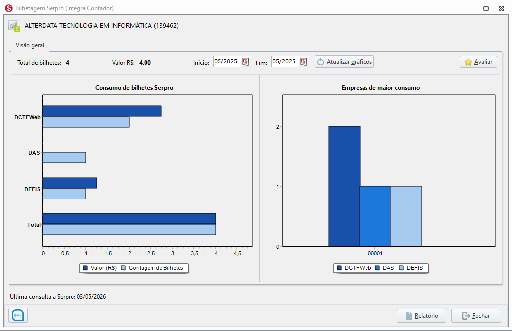 O painel Bilhetagem Serpro é uma nova funcionalidade no sistema Fiscal que oferece uma demonstração gráfica do uso mensal de bilhetes Serpro no seu escritório, permitindo que você visualize o consumo total de todas as empresas de forma consolidada, auxiliando no acompanhamento e transparência dos envios de diversas obrigações como DAS, DEFIS e DCTFWEB pelo API Serpro.