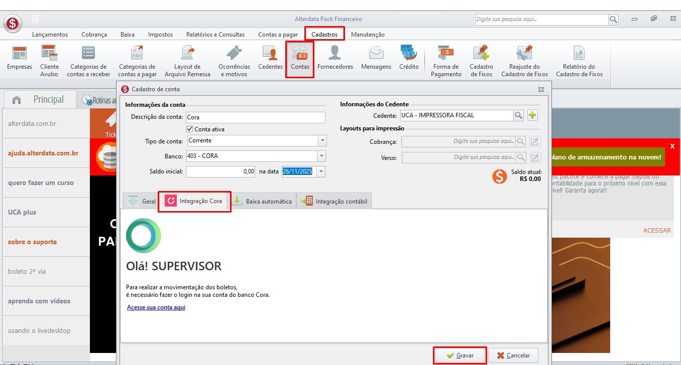 - Clique na aba Integração Cora e faça login na sua conta do banco informando CPF e senha;