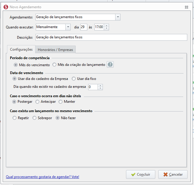 - Na aba Configurações, selecione o Período de Competência, a Data de Vencimento e uma das opções caso o vencimento ocorra em dias não úteis ou caso exista um lançamento no mesmo vencimento;