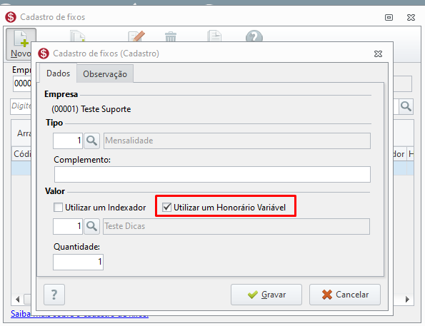 Caso seja necessário realizar o vínculo de outras subcategorias às empresas, basta clicar em Cadastrar Fixo, marcando a opção Utilizar um Honorário Variável e realizar as configurações.