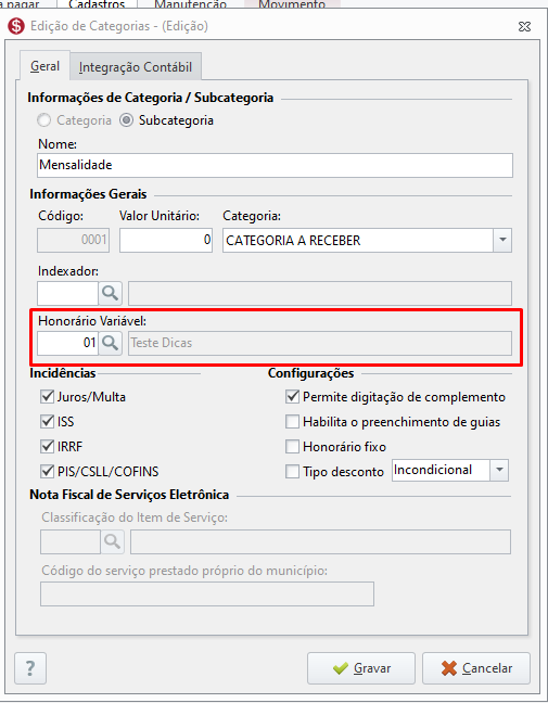 - Adicione a Subcategoria configurada com o Honorário Variável;