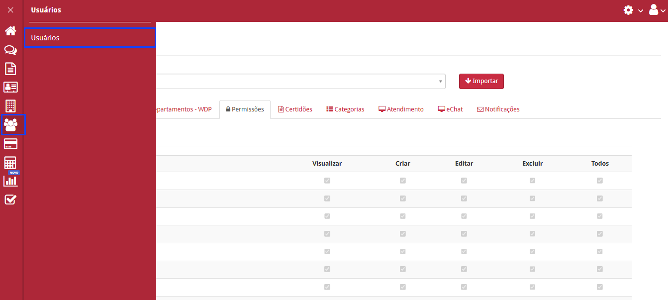 No cadastro do usuário, acesse a aba Permissões e realize as configurações de acordo com o que deseja que este usuário tenha acesso, e se este acesso permitirá, Visualizar, Criar, Editar e/ou Excluir;
