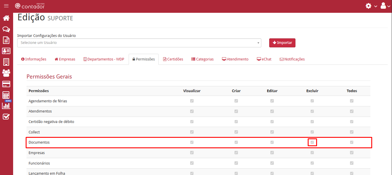 - Na aba Permissões, marque em Documentos a opção Excluir;