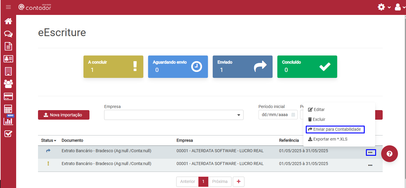 - Enviado:Lançamentos enviados para a contabilidade, prontos para integração com o Contábil Alterdata.