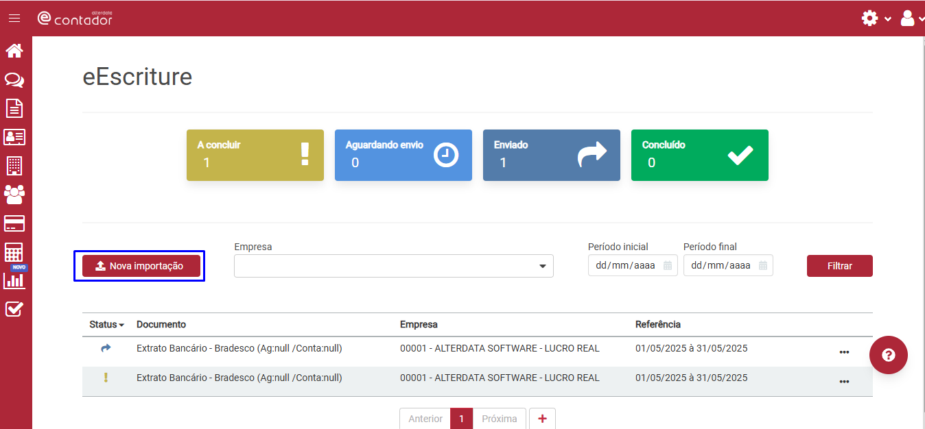 Na tela inicial do eEscriture, após realizar a importação do primeiro Extrato Bancário, será demonstrado os status: