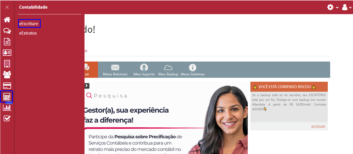 - Após acessar o eContador, clique na aba Contabilidade - eEscriture;