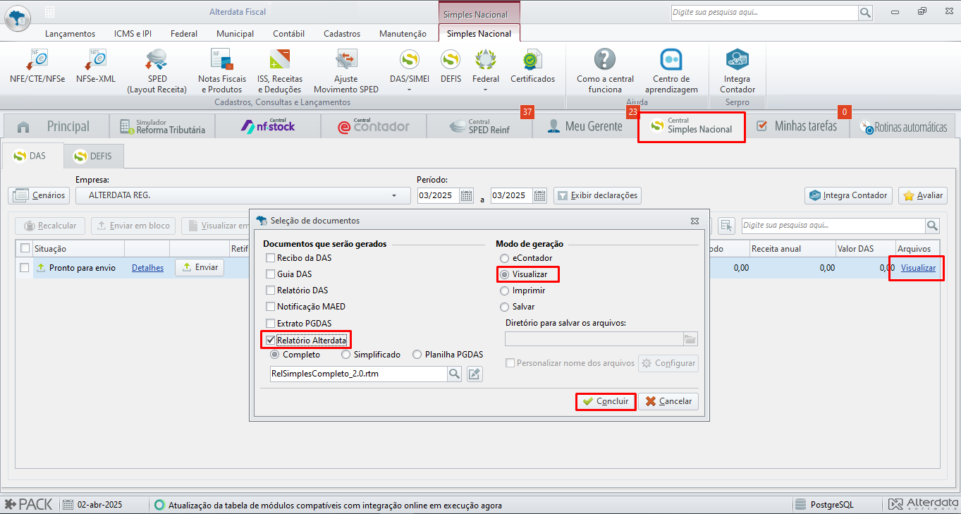 - Em Documento que serão gerados, marque a opção Relatório Alterdata e em Modo de geração marque Visualizar;