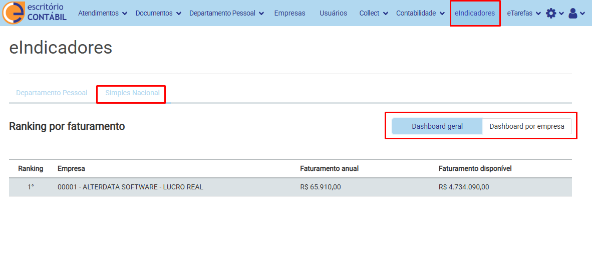 Para os indicadores do Fiscal serão apresentadas somente empresas do Simples Nacional. Caso a empresa se enquadre em outro regime tributário, não será exibida.
