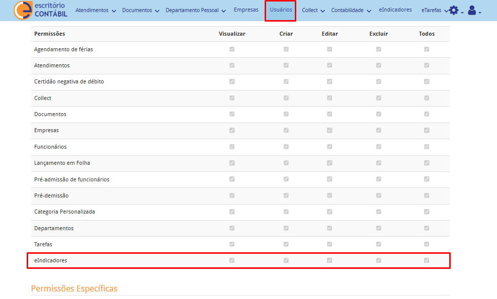 - Clique na opção Permissões e no grid em eIndicadores, marque as permissões desejadas;