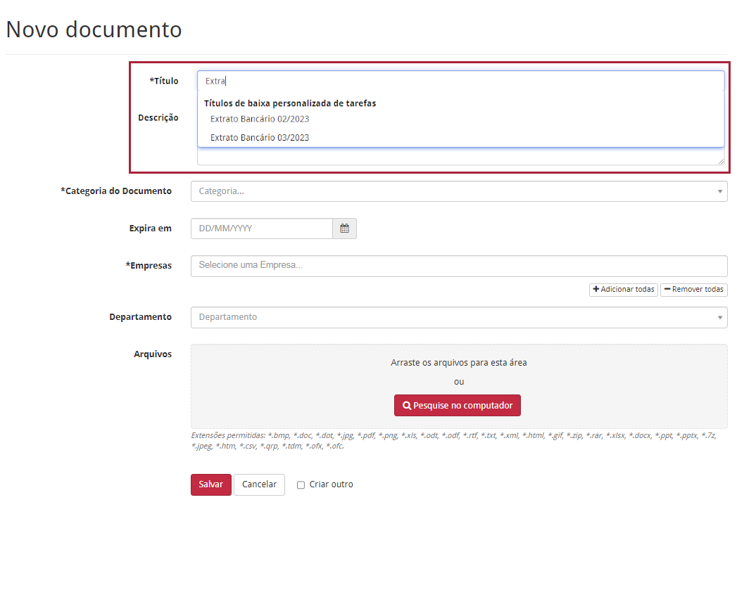 Exemplo:Se foi cadastrada uma tarefa de Extrato Bancário no momento de envio do documento, deverá ser selecionado o título Extrato Bancário + Período, ou seja, o mês a que se refere aquele extrato.